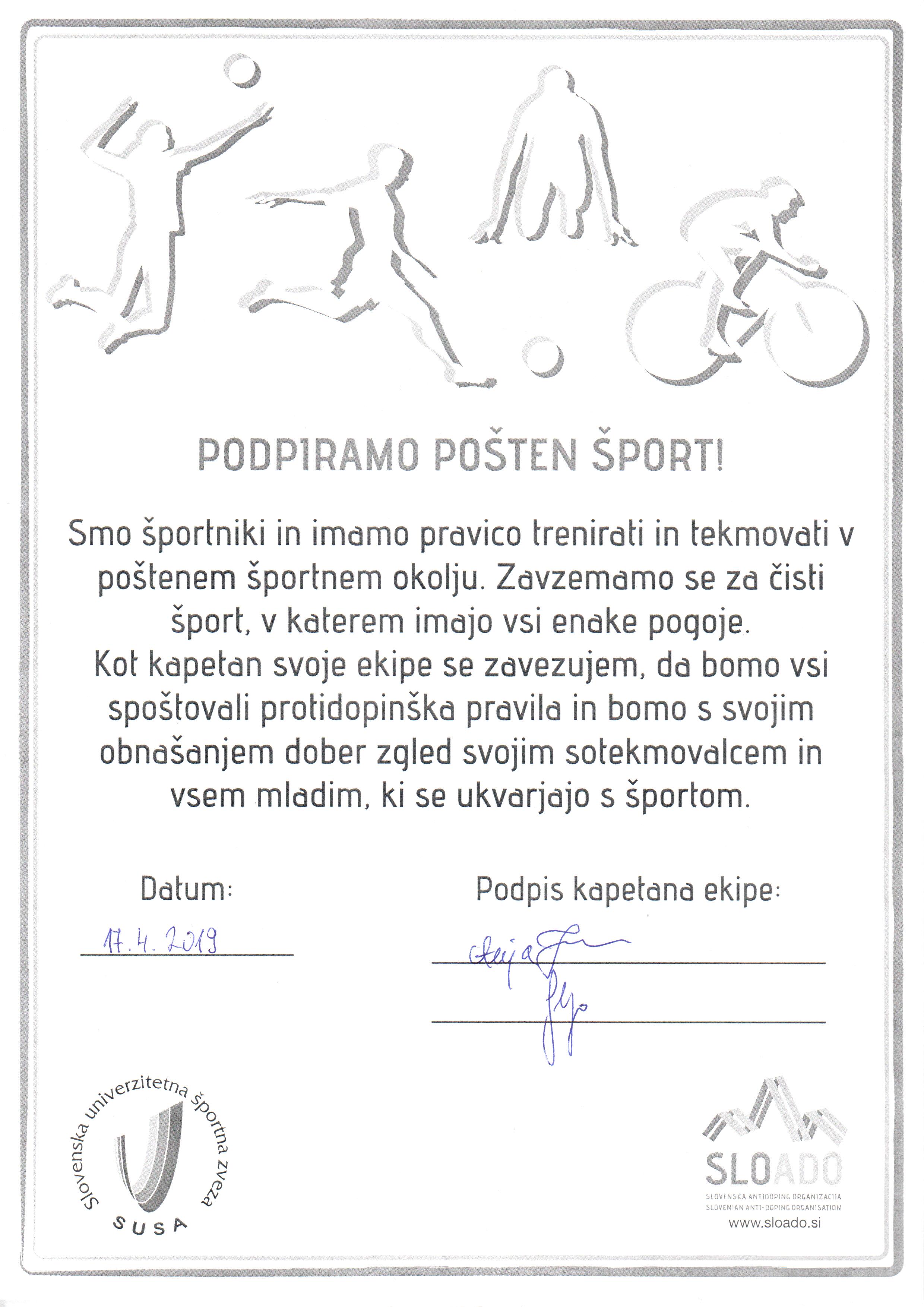 Kapetani v ekipnih športih so prebrali SLOADO zaobljube ter podpisali izjavo, da ne zlorabljajo prepvoedanih substanc v športu.
